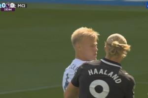 体育资讯08月31日讯 曼城vs布莱顿第9分钟,哈兰德单刀力量太小被没收!随后回头和跟防的范赫克顶牛!