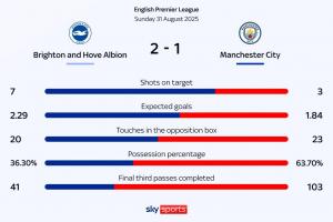 上一篇: 布莱顿2-1曼城全场数据:射门12-12,射正7-3,控球率36%-64%