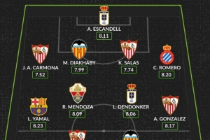 体育资讯9月1日讯 本轮西甲战罢,数据网站Whoscored也评出本轮西甲最佳阵,其中亚马尔领衔入选,具体如下: