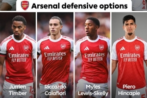 英超官方晒阿森纳防线阵容,八名球员在列:萨利巴、莫斯克拉、本-怀特、加布里埃尔、廷伯、卡拉菲奥里、斯凯利、因卡皮耶。