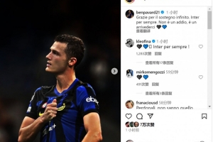 帕瓦尔社媒晒出身穿国米球衣的照片,并配文:“感谢你们无尽的支持。永远的国米。这不是告别,而是后会有期。”