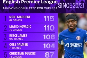 近5年蓝军过人榜:马杜埃凯压科瓦西奇居首,詹姆斯&帕尔默在列