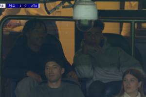 比赛转播镜头给到了看台上观战的杜埃,他在国际比赛日中受伤,缺席了本场巴黎的大名单。