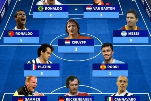 前锋:C罗(5次)、罗纳尔多(2次)、范巴斯滕(3次)、梅西(8次)