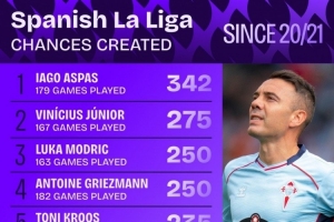 20-21赛季以来西甲创造机会榜:阿斯帕斯居首,维尼修斯次席