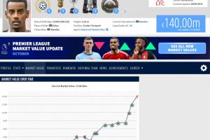 德转管理员表示:“所有人都认为伊萨克的转会费将打破英超纪录,事实果然如此。这名瑞典前锋以1.45亿欧元基础转会费登陆安菲尔德,其市场价值随之升至1.4亿欧元。