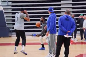 别闹伤还没好呢😂!欧文训练时想和浓眉单挑 被基德及时制止