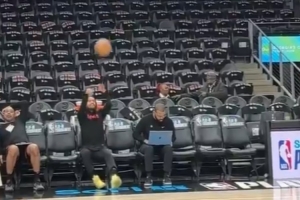 赛前热身环节,老鹰球星特雷-杨坐在替补席,随手一甩皮球空心入网,展现了不俗的力量和手感。