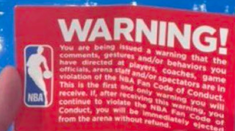 这张纸上的内容为:“您对球员、教练、裁判、场馆工作人员和/或观众发表的言论、做出的手势和/或行为违反了NBA球迷行为准则。这是您唯一一次收到警告。如果您在收到此警告后继续违反NBA球迷行为准则,您将被立即驱逐出场。”